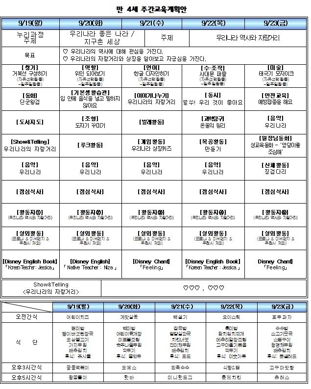 만4세 | 기본생활습관,안전교육,수락산숲체험,원장님동화,Show&Telling,도서지도,언어전달(문장), 누리과정대소집단놀이활동,실외활동놀이한글,놀이수학,자유선택활동(역할,미술,수학,언어, 운동,과학,음률,감상,창의),목공,조형,루크,신체-체육(외부강사),표현–발레(외부강사), 영어Disney교재 및 외부강사(한국인1분 원어민1분),유아un+plugged 코딩수업 |
